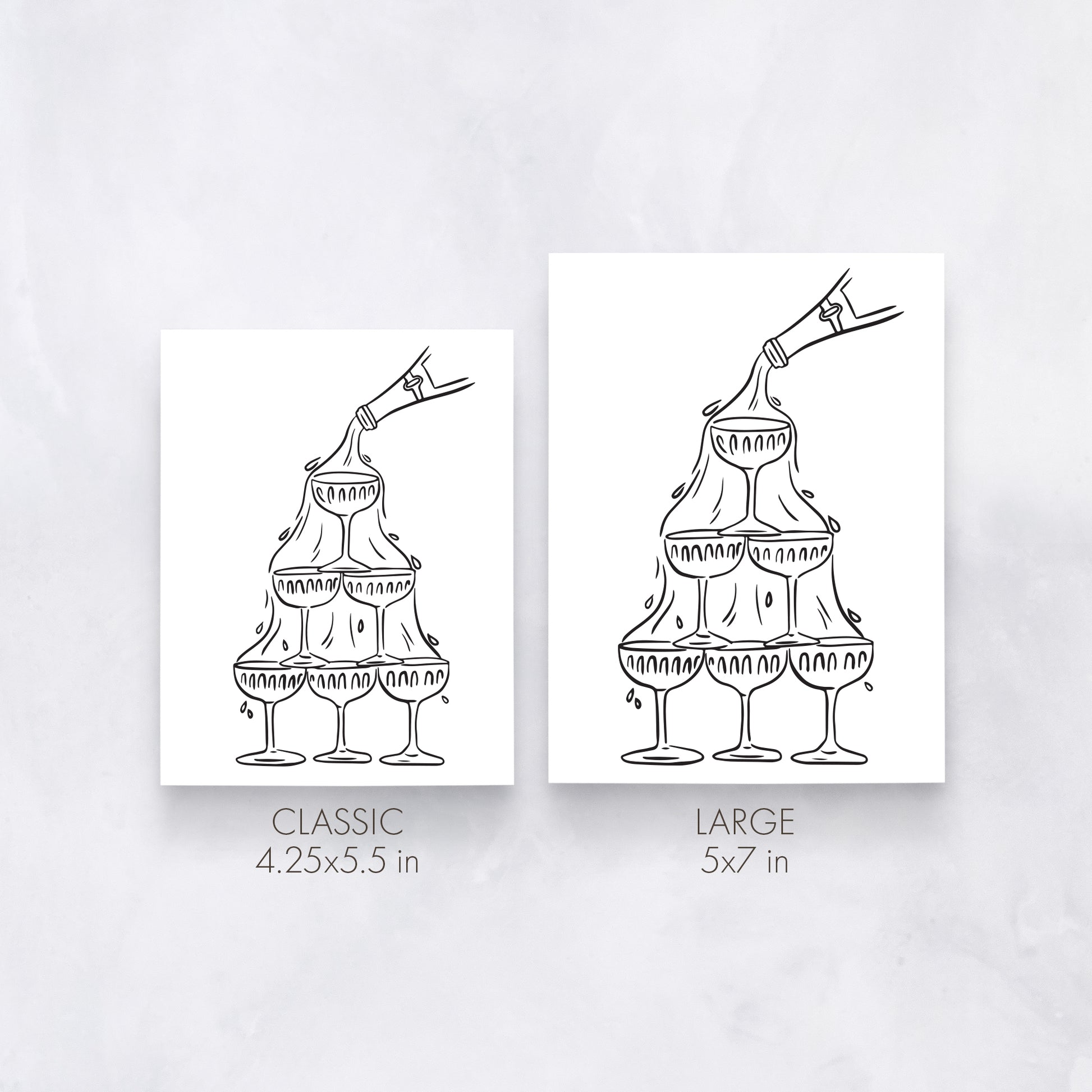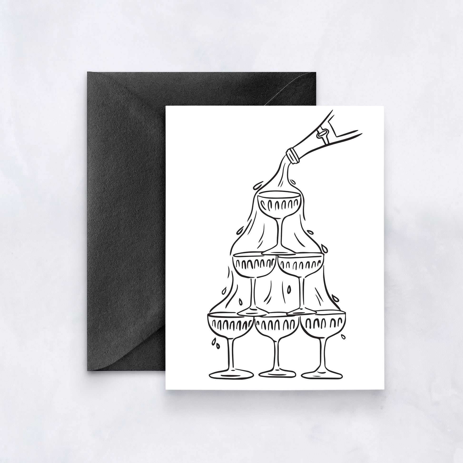A chic and modern card featuring line art of a champagne tower being poured — perfect for weddings, engagements, New Year’s, or any celebratory moment. Blank inside so you can add your own toast or heartfelt message.