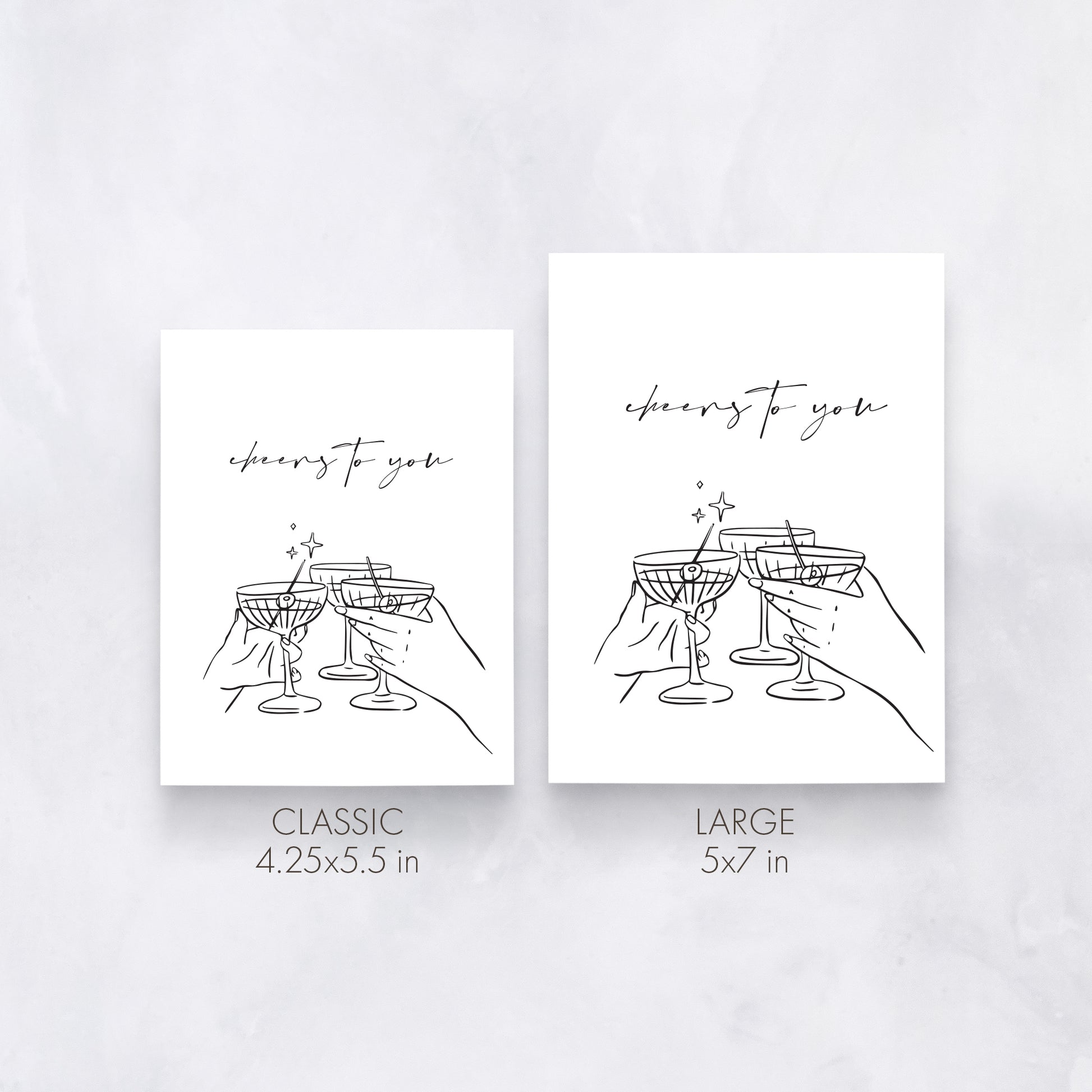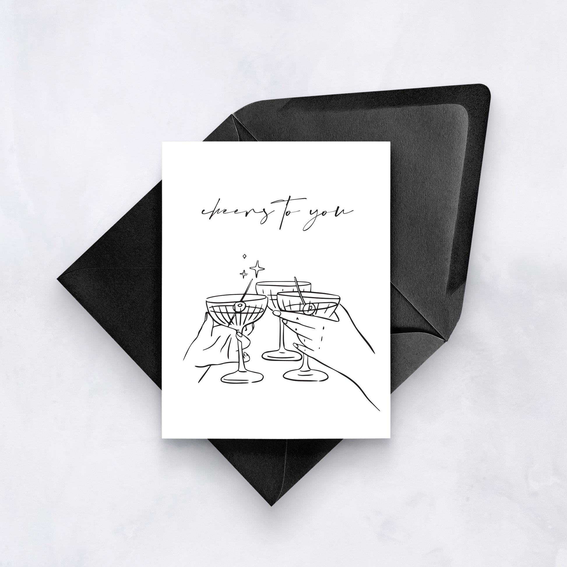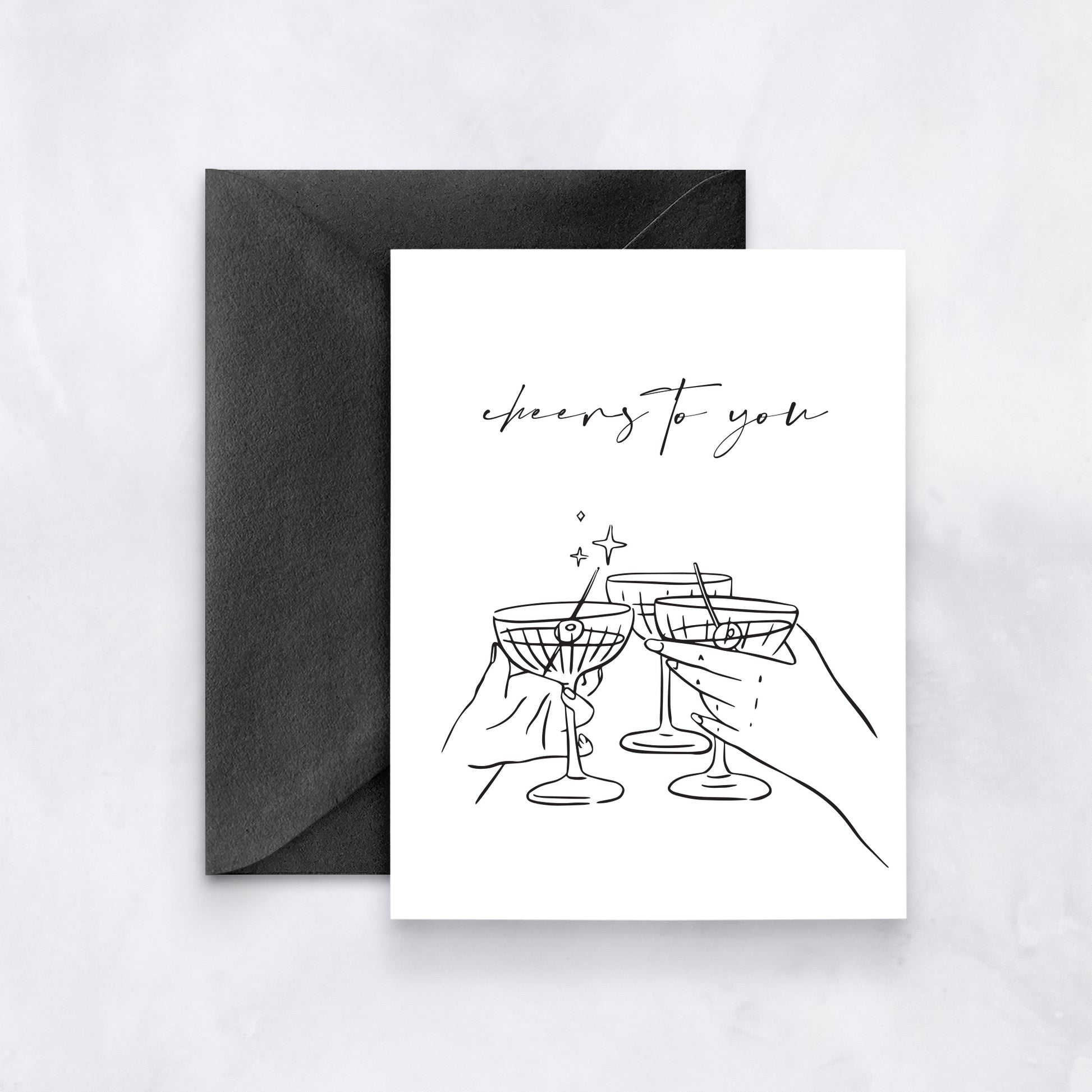 Raise a glass with this modern celebration card featuring minimal line art of cocktail clinks and the handwritten message “cheers to you.” A stylish pick for birthdays, engagements, or any toast-worthy occasion.