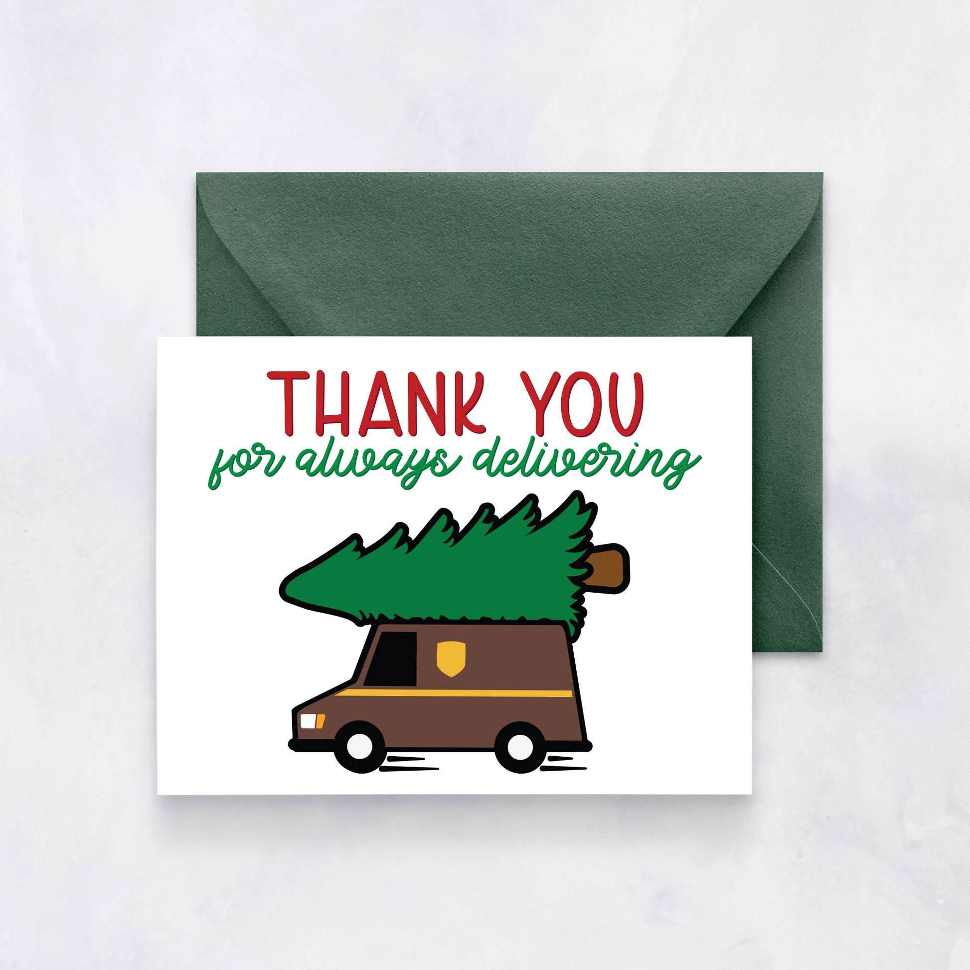 Celebrate your hardworking delivery driver this holiday season with a festive card featuring a brown truck hauling a Christmas tree. A thoughtful way to say “thank you for always delivering” during the busiest time of year.