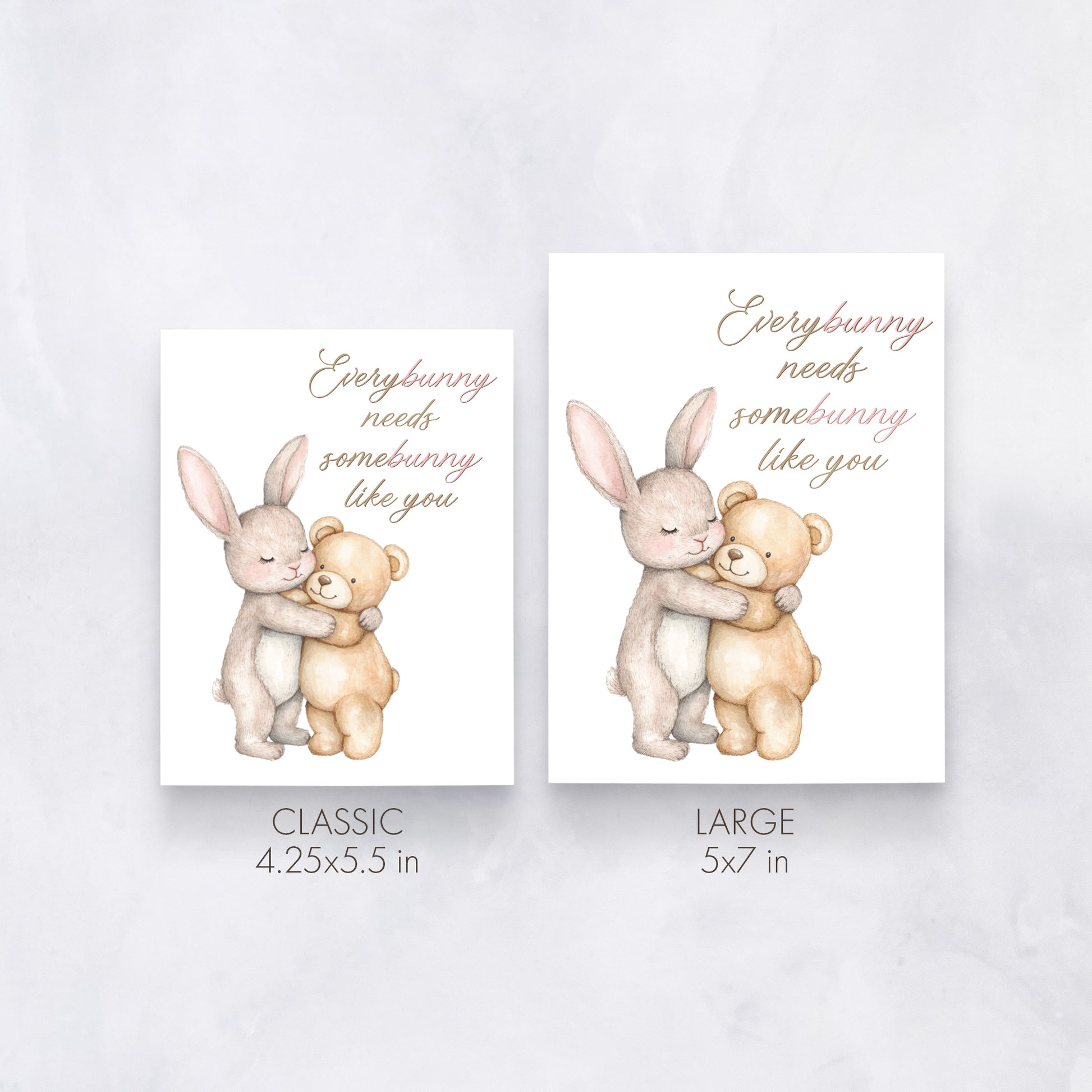 This adorable greeting card features a soft watercolor bunny hugging a teddy bear with the playful phrase “Everybunny needs somebunny like you.” Perfect for showing appreciation to friends, loved ones, or anyone who makes life sweeter. Great for Easter but also birthdays, anniversaries, Valentine’s Day!