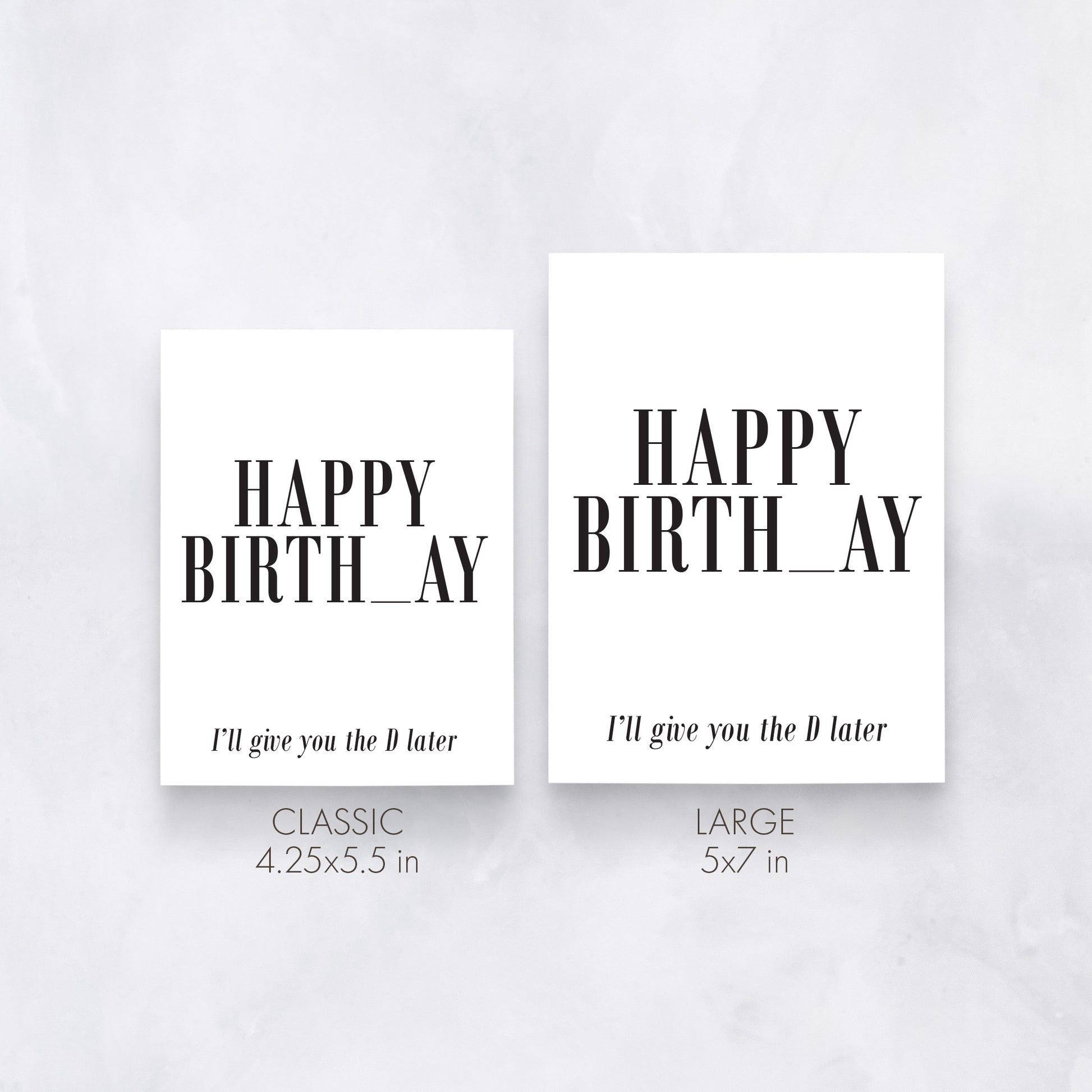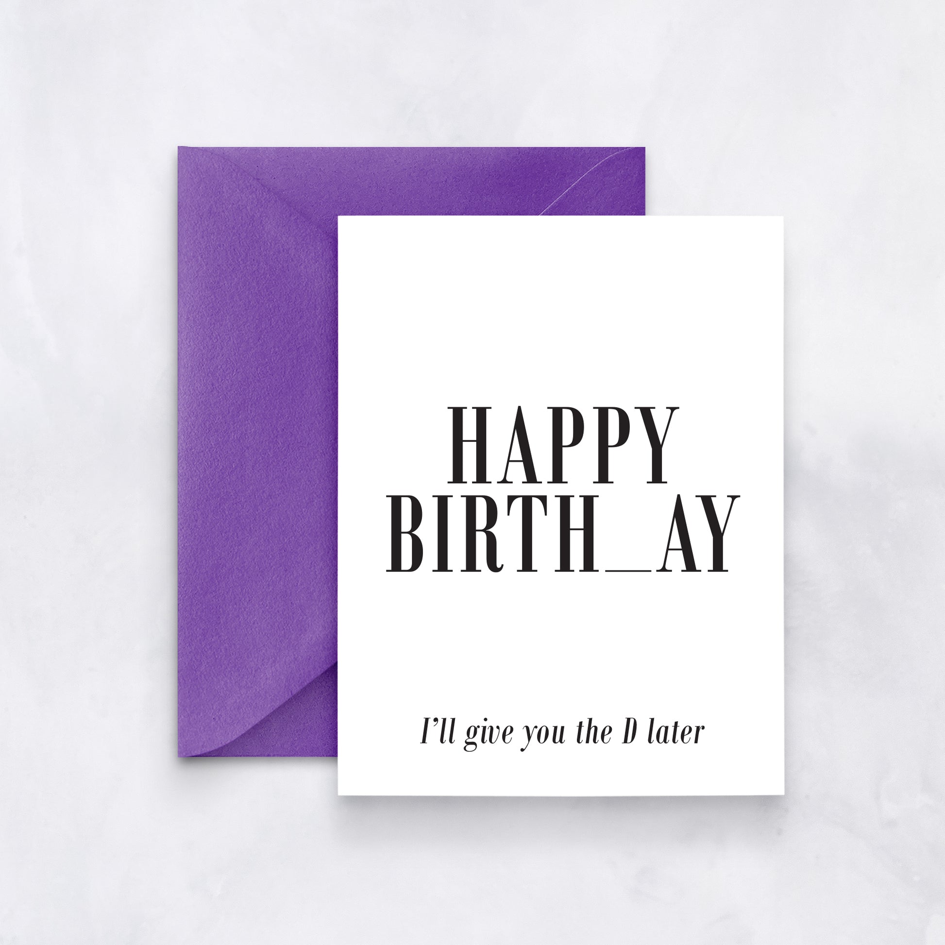 A little naughty, a lot of fun — this cheeky black and white birthday card skips the “D” in “happy birthday”... but promises to make up for it later. Perfect for your partner or someone with a great sense of humor.