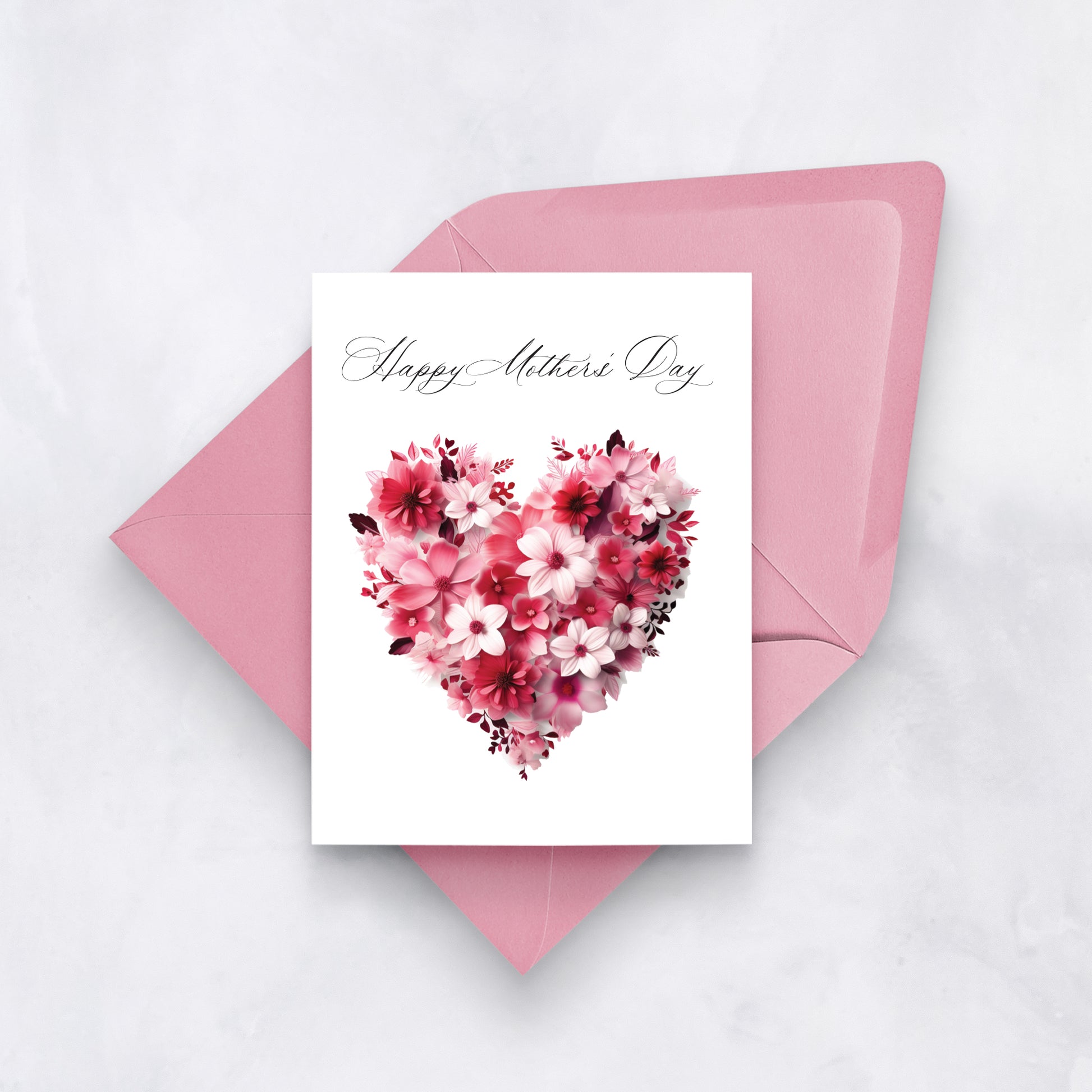 Show your love with this romantic and classic Mother’s Day card. A heart made of pink and red flowers makes a bold and heartfelt statement for any mom.