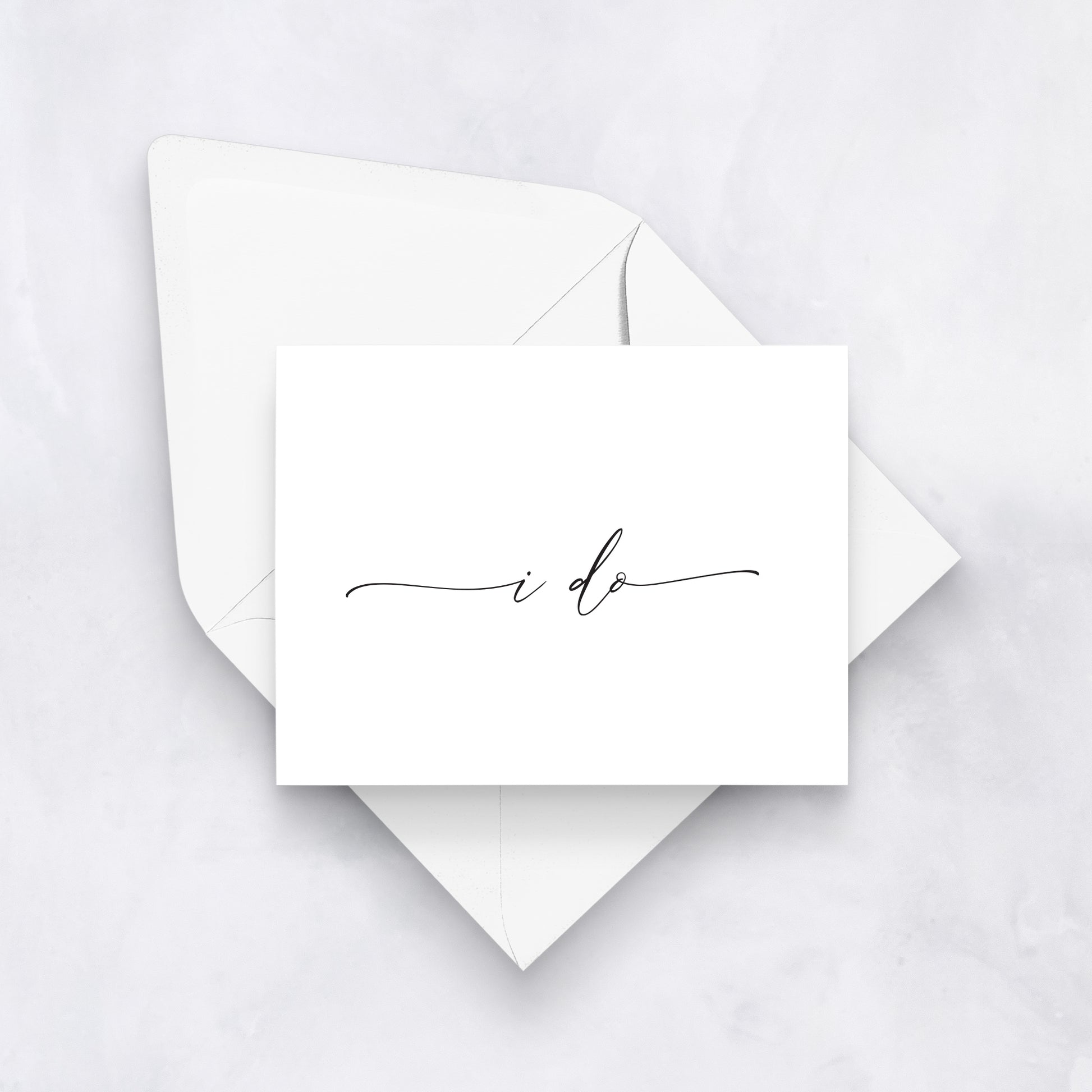 A beautifully simple set of I Do wedding cards, perfect for exchanging vows or wedding morning notes. With clean black script on crisp white cardstock, this set includes matching envelopes for an effortlessly elegant presentation.