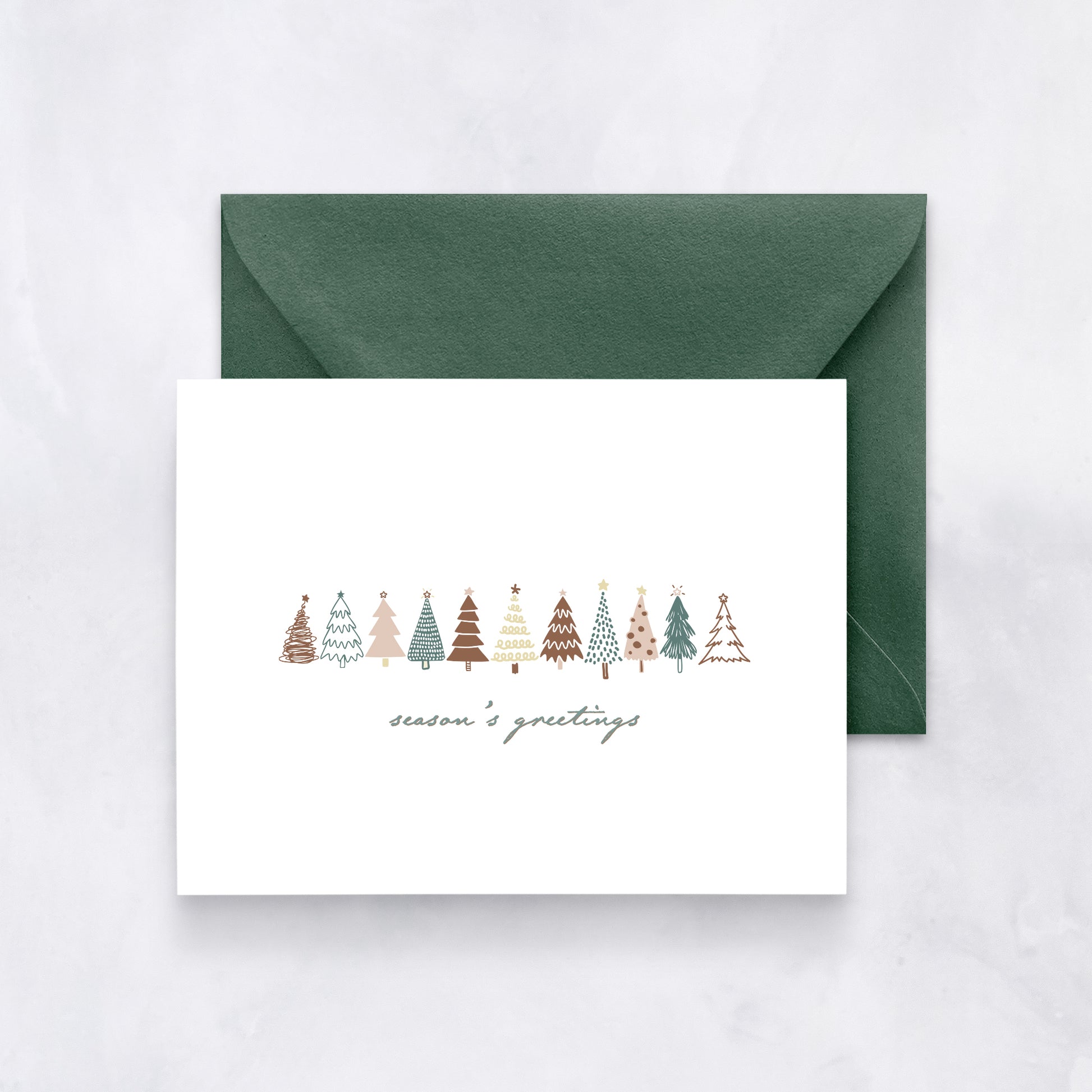 A minimal holiday card featuring a lineup of whimsical Christmas trees and the phrase “season’s greetings” in a soft, modern script. Perfect for sending warm wishes to friends, family, coworkers, or clients this winter.