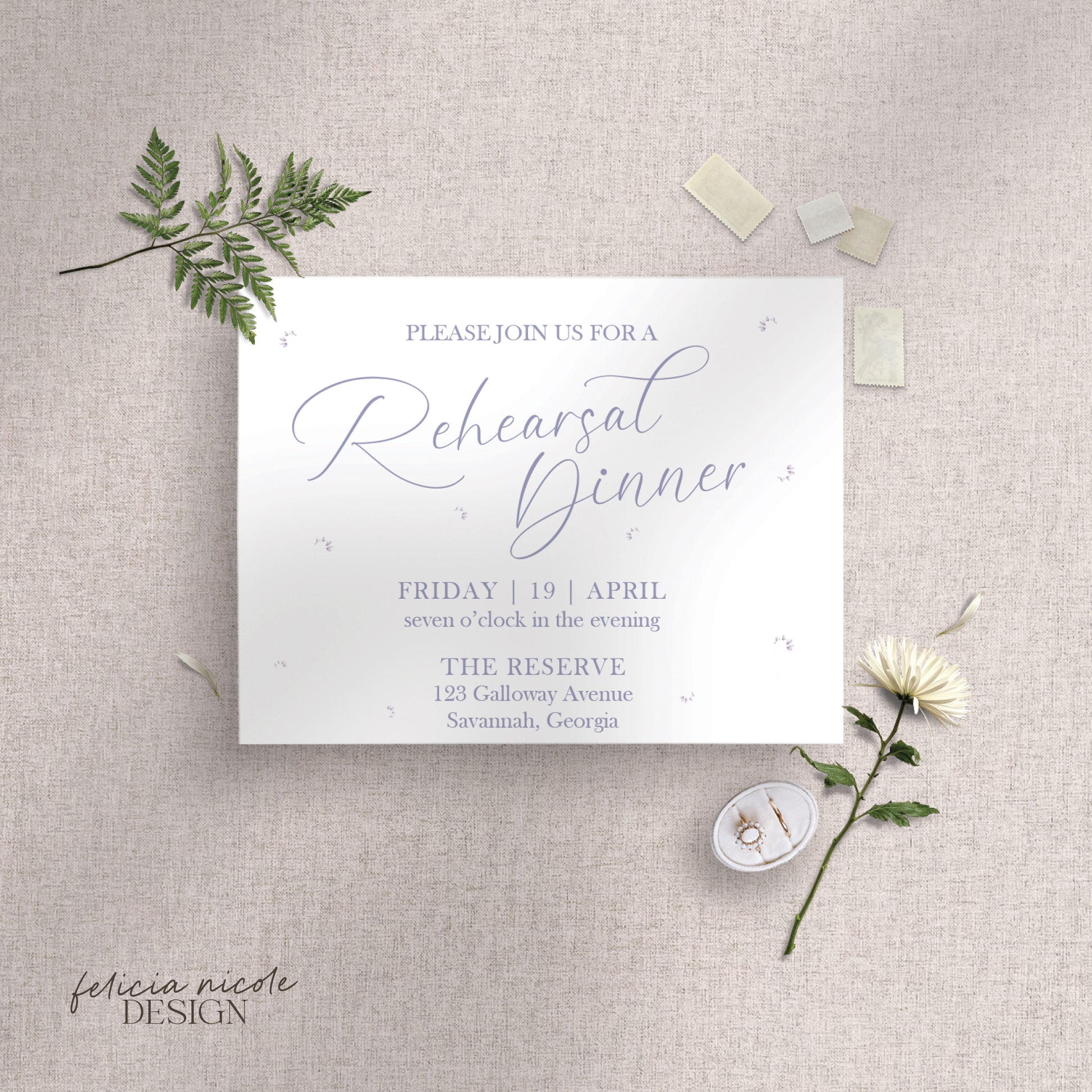 Set the stage for your wedding weekend with our rehesarsal dinner invitations that make the perfect add-on to The Amy suite. Featuring a charming design of small lilac flowers this rehearsal card is perfectly suite for a memorable evening with your closest friends and family.