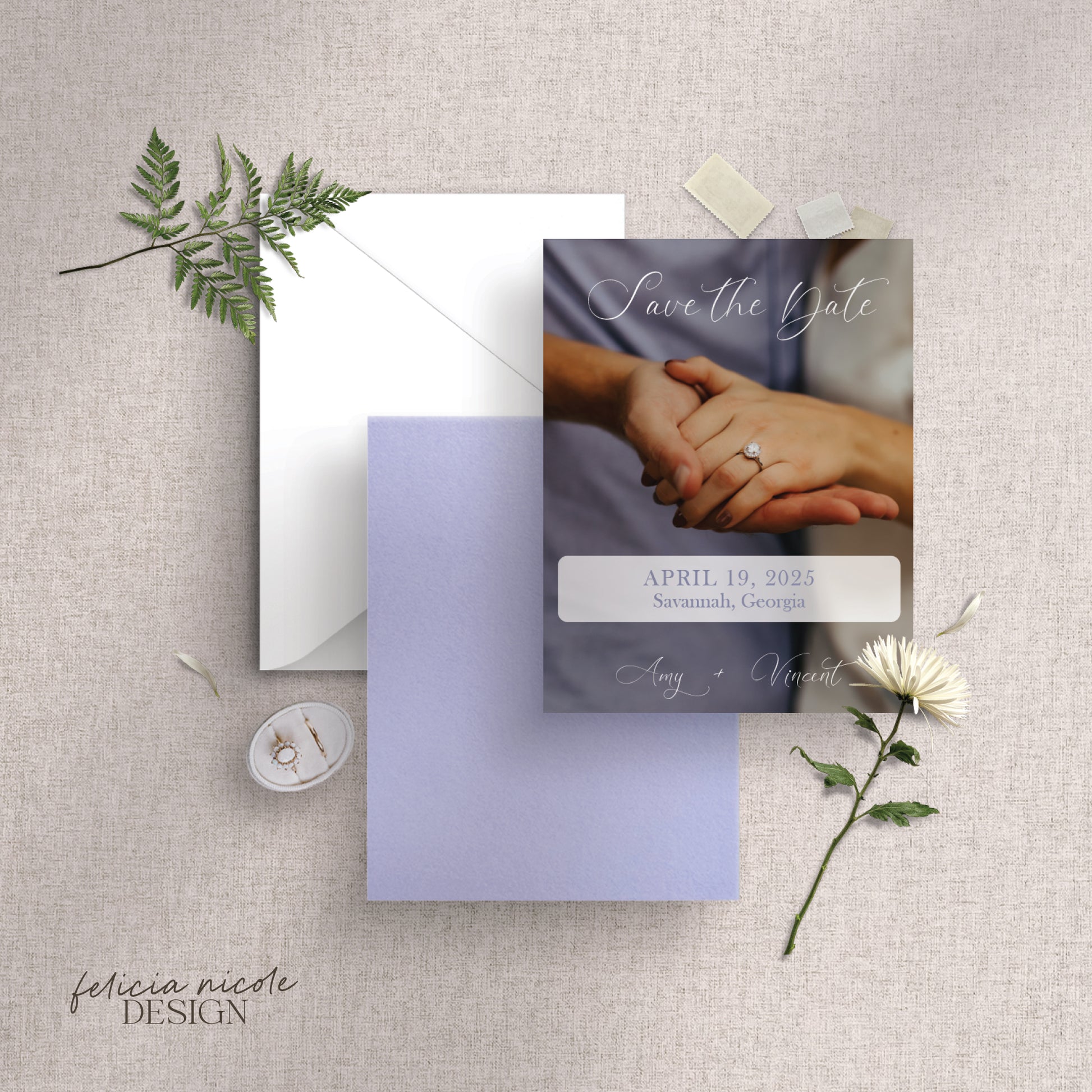 Announce your special day in style with Save the Dates that match The Amy suite perfectly. Featuring a delicate lilac design with a custom photo and matching addressed light purple envelopes these beautifully crafter save the dates set the tone for your wedding day.