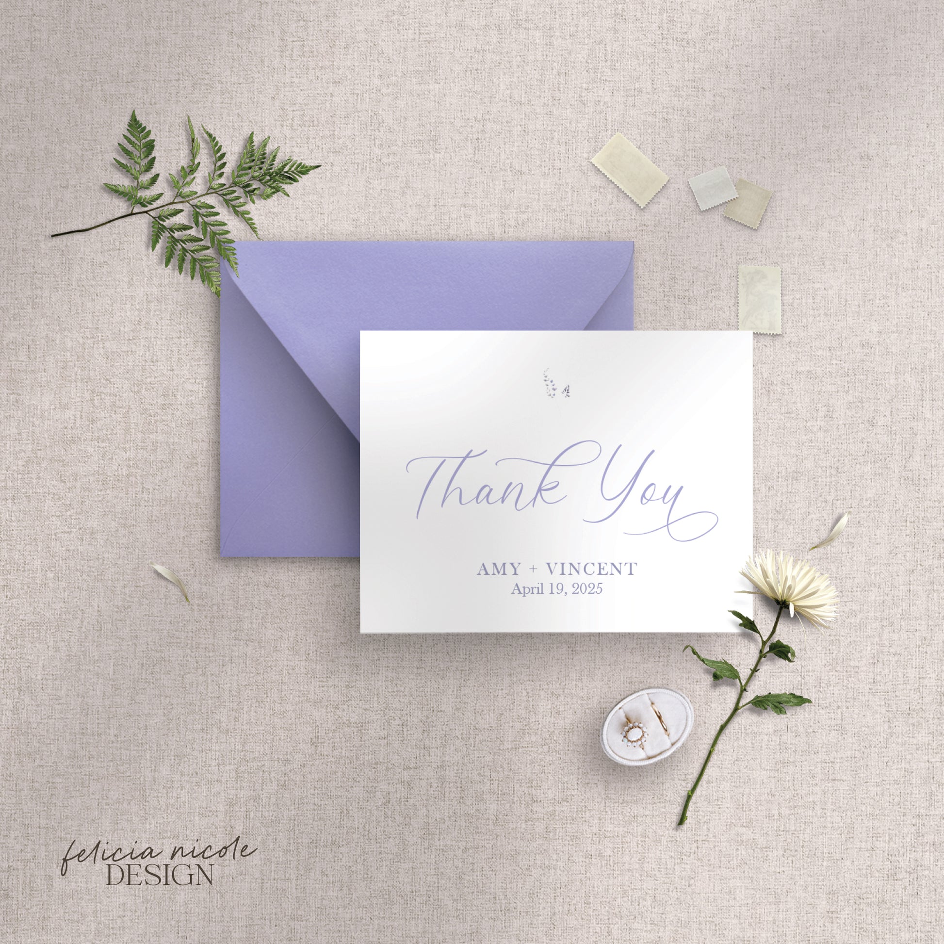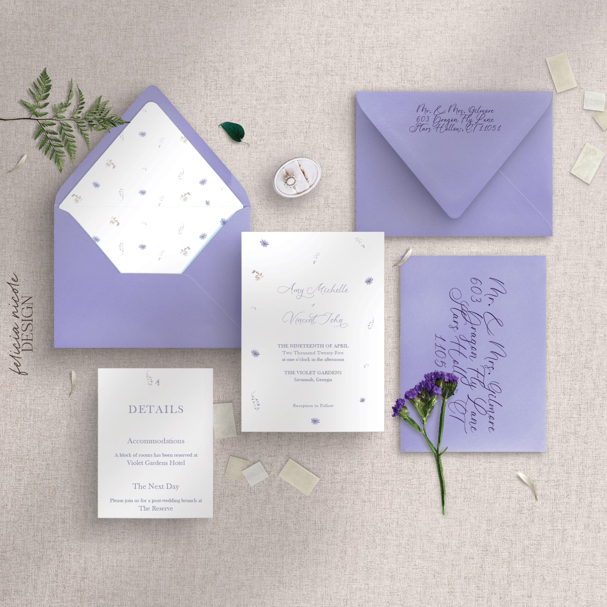 Set the tone for your big day with The Amy, our wedding invitation suite featuring a timeless design of elegant lilac flowers and a coordinating light purple envelope. With options of 3 pieces, 4 piece and 5 piece suites, this design offers everything you need to announce your special day in style.