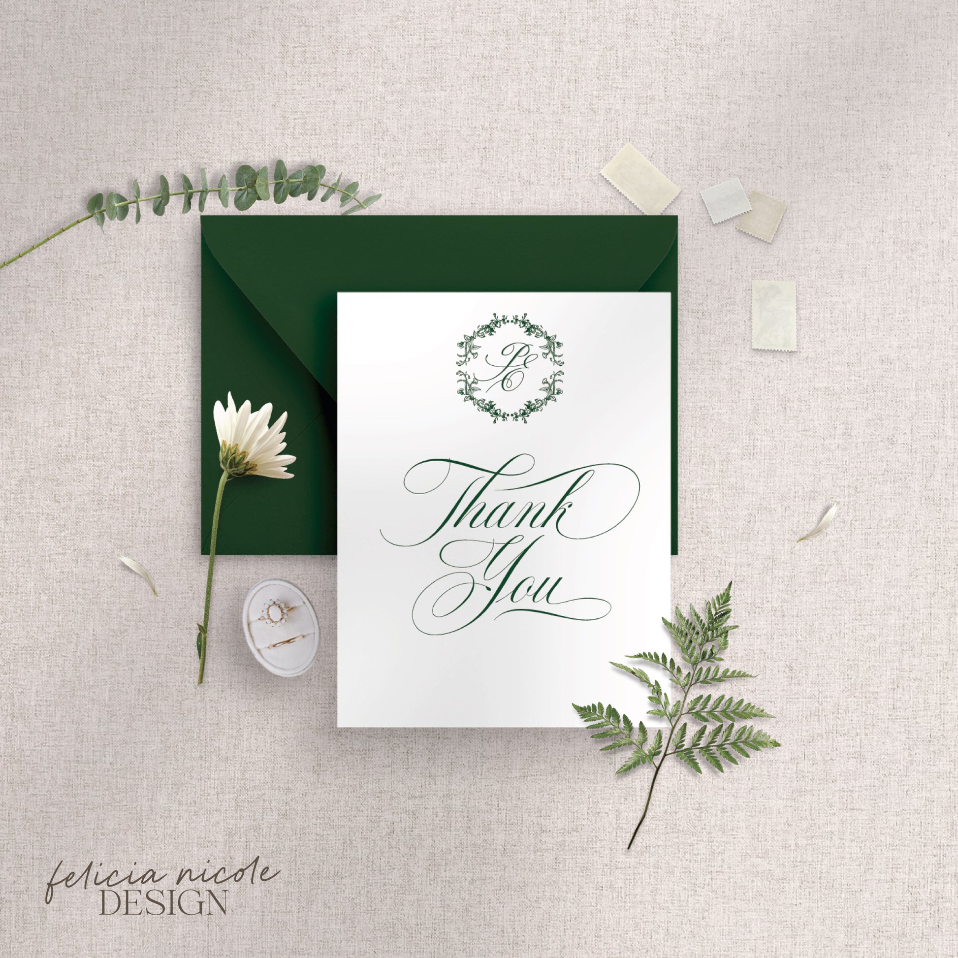 Show your appreciation with our elegant thank you cards from The Eva collection. Featuring deep greens and a natural design these are perfect for a wedding in any season.