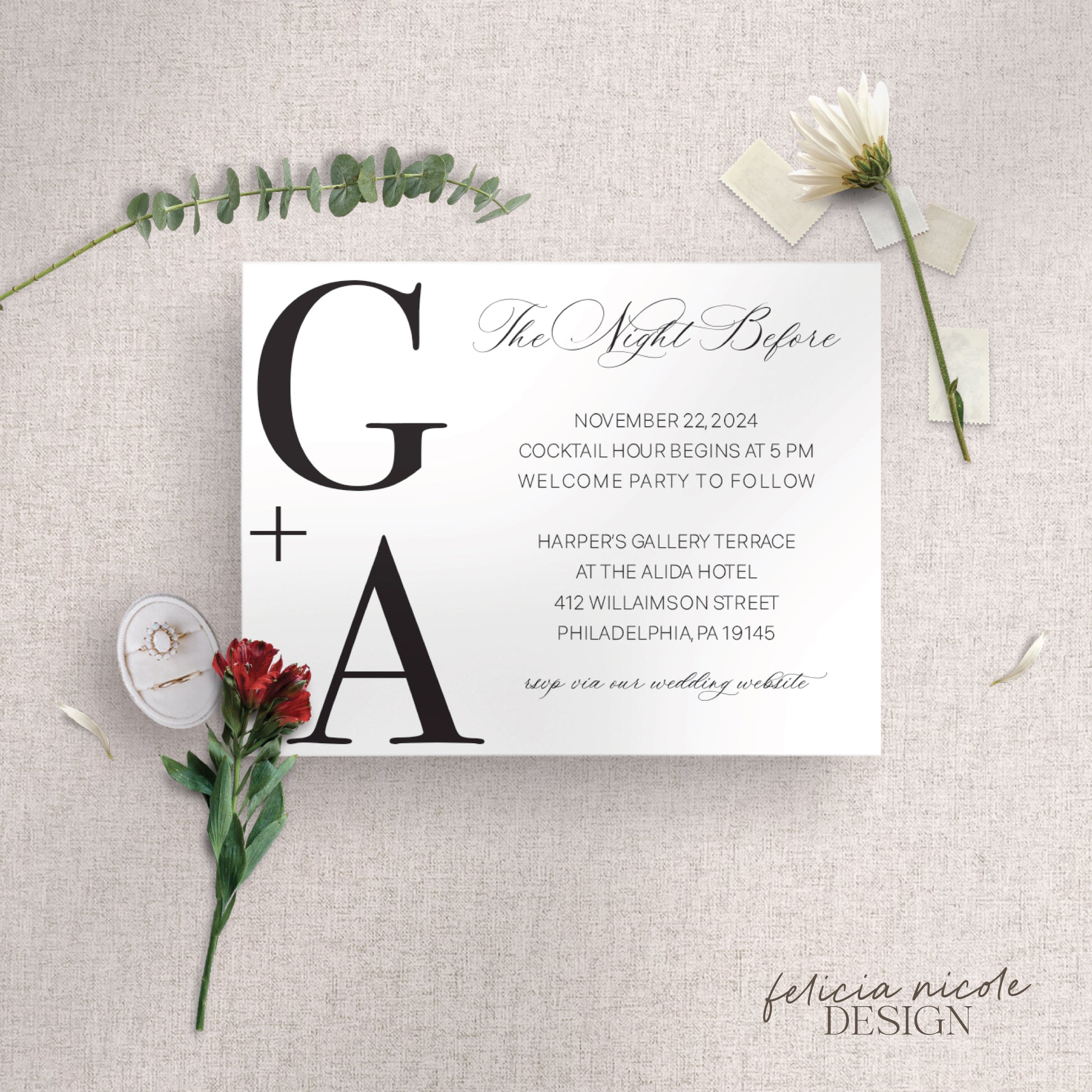 Invite your loved ones to an iconic pre-wedding celebration with The Philly rehearsal dinner cards. With crisp typography and sophisticated details, it sets the tone for a chic celebration.