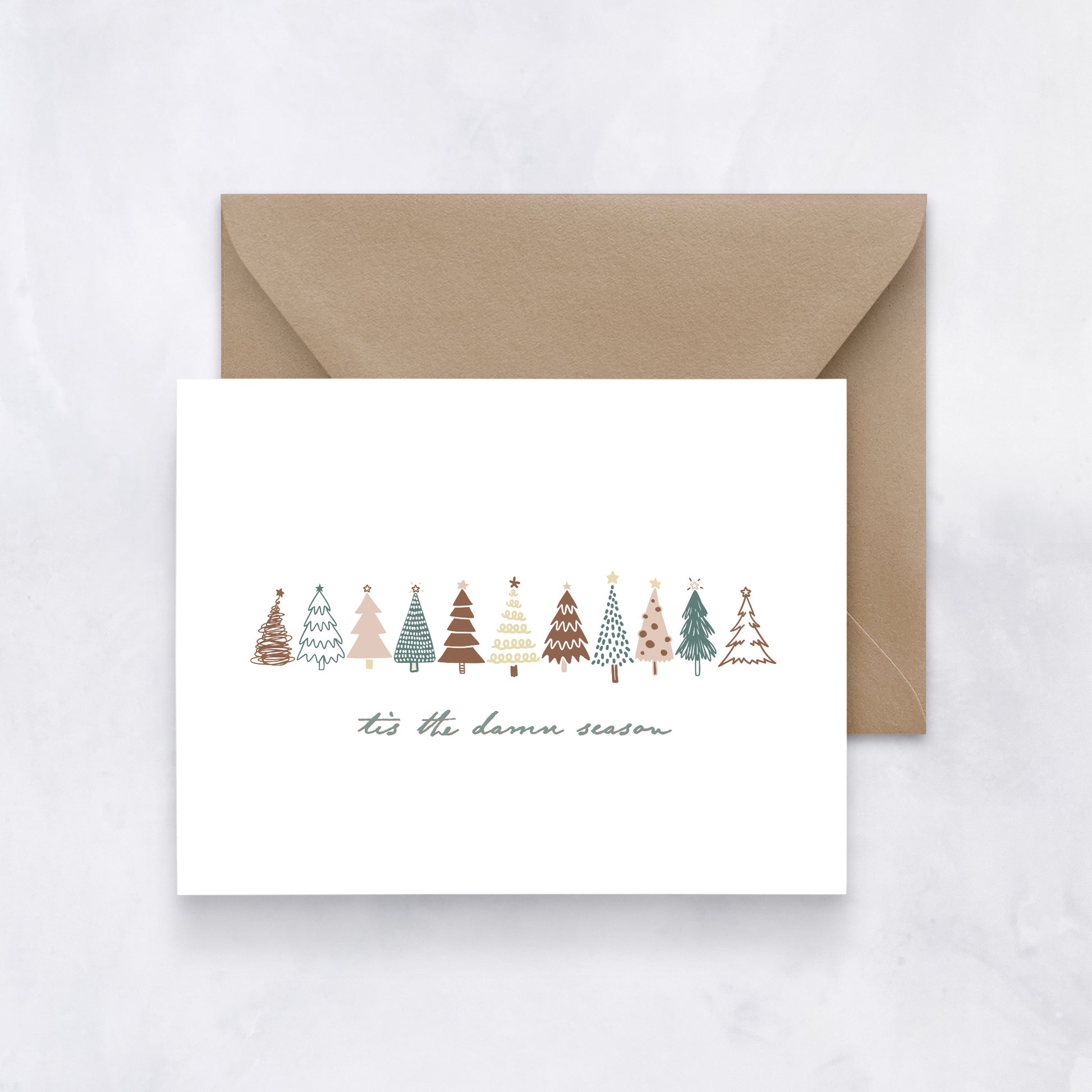 This cheeky holiday card features a row of whimsical Christmas trees above the phrase “’tis the damn season” in a stylish script. A fun and relatable card for anyone who loves the holidays—but also kinda hates them.