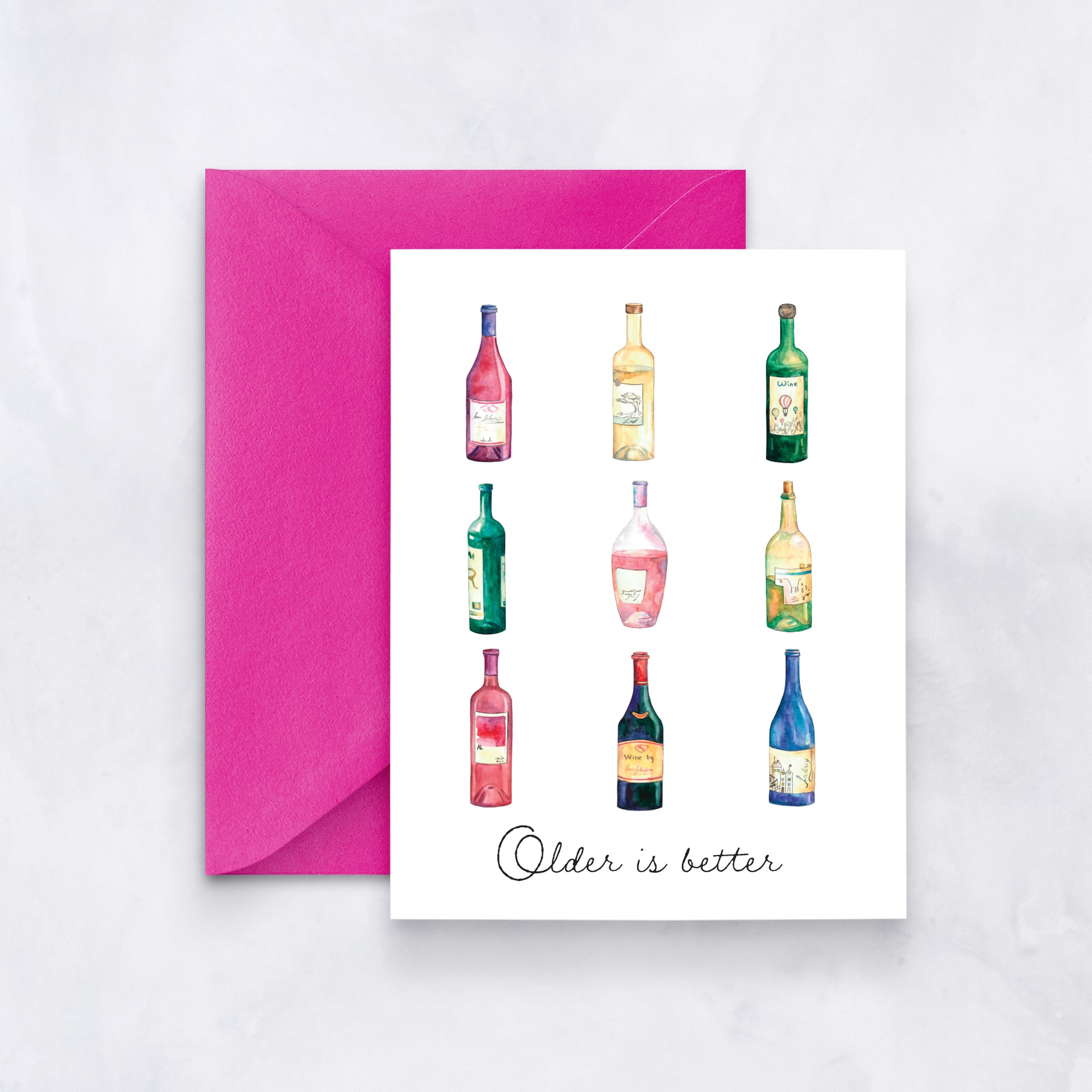 Aged to perfection — just like wine. This colorful birthday card features watercolor wine bottles and the phrase “Older Is Better,” making it the perfect pick for wine lovers, besties, and anyone who gets better with age.