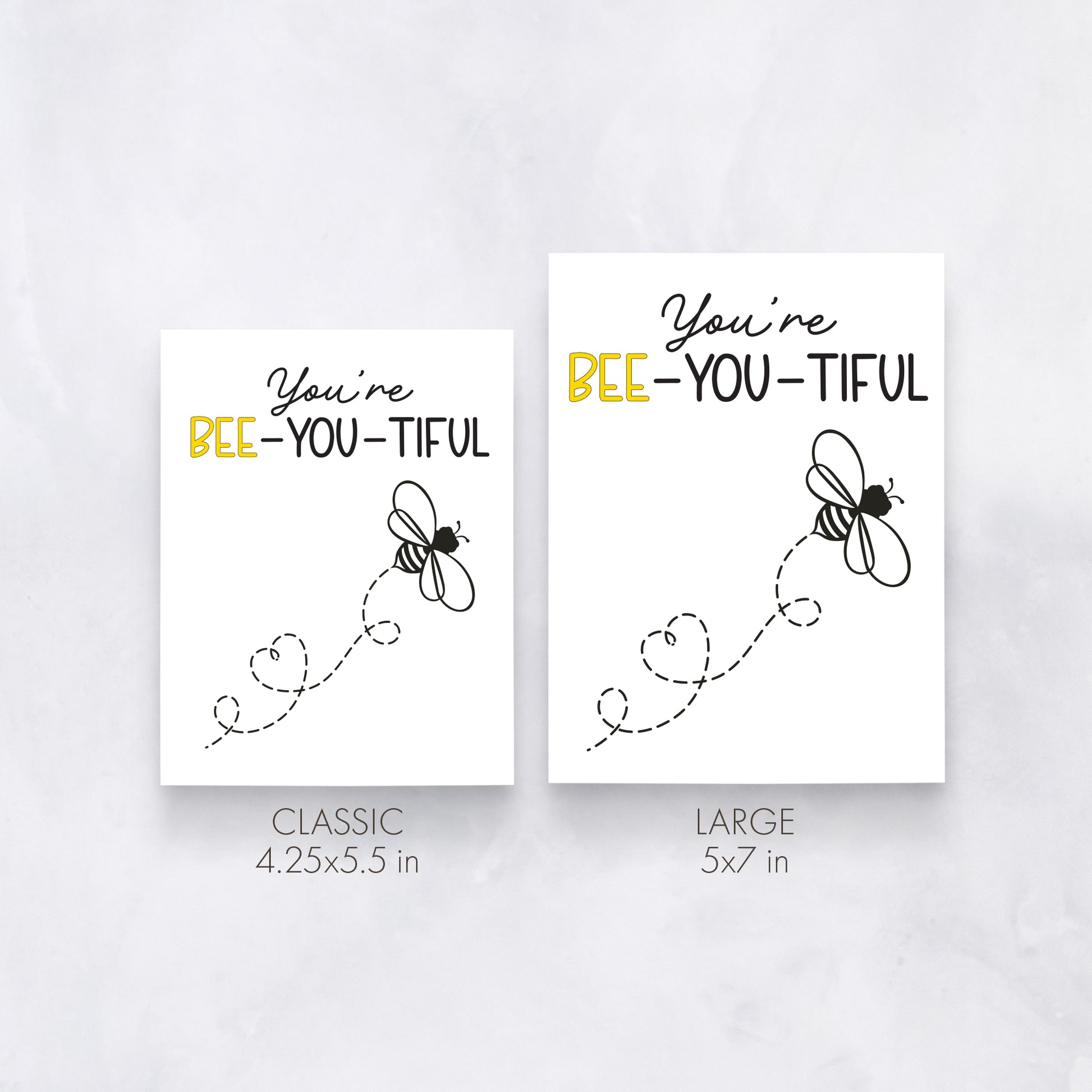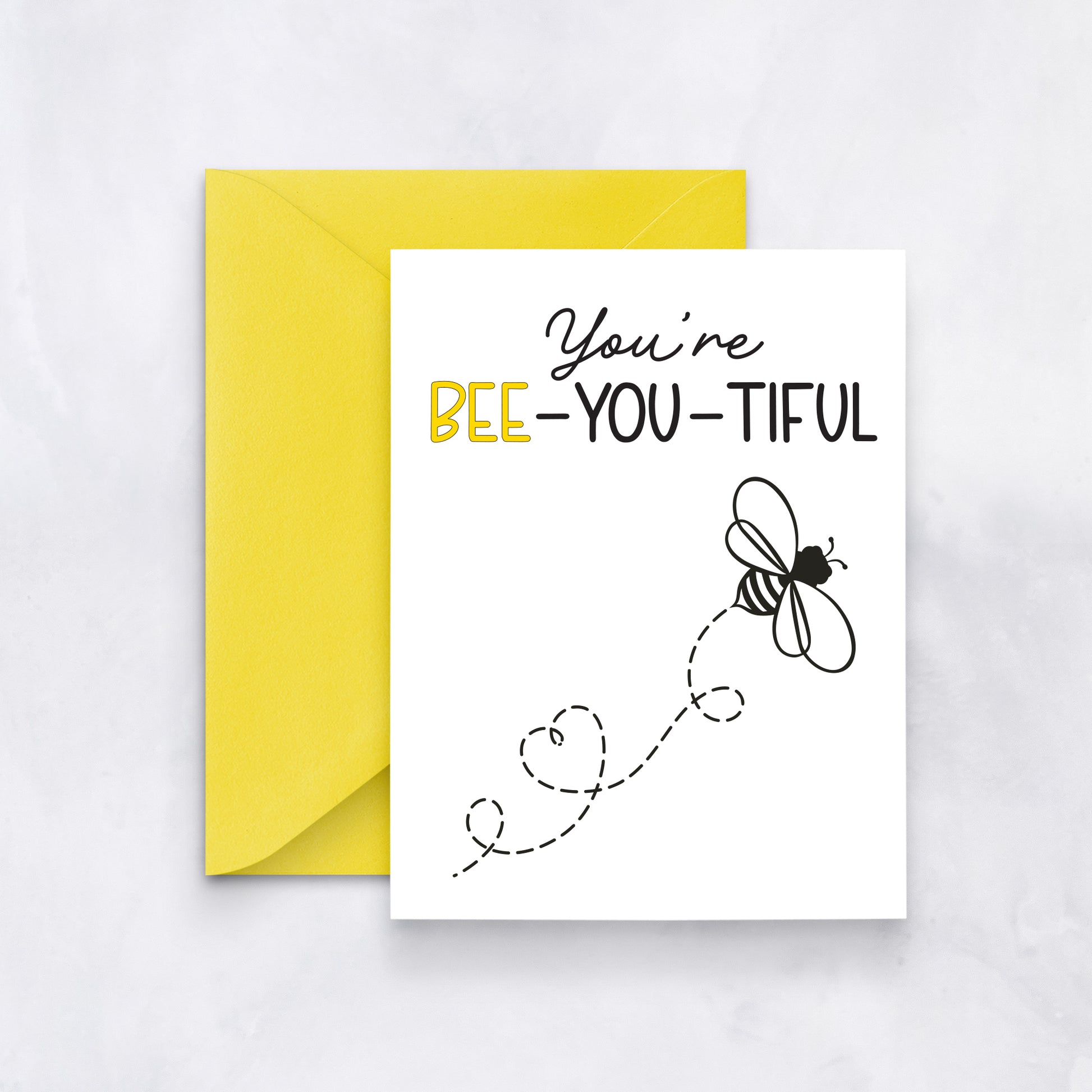 This sweet greeting card features a buzzing bee and the playful pun “You’re Bee-You-Tiful.” A fun way to brighten someone’s day and remind them how wonderful they are. Great for Valentine’s Day, anniversaries, birthdays, or sending encouragement.
